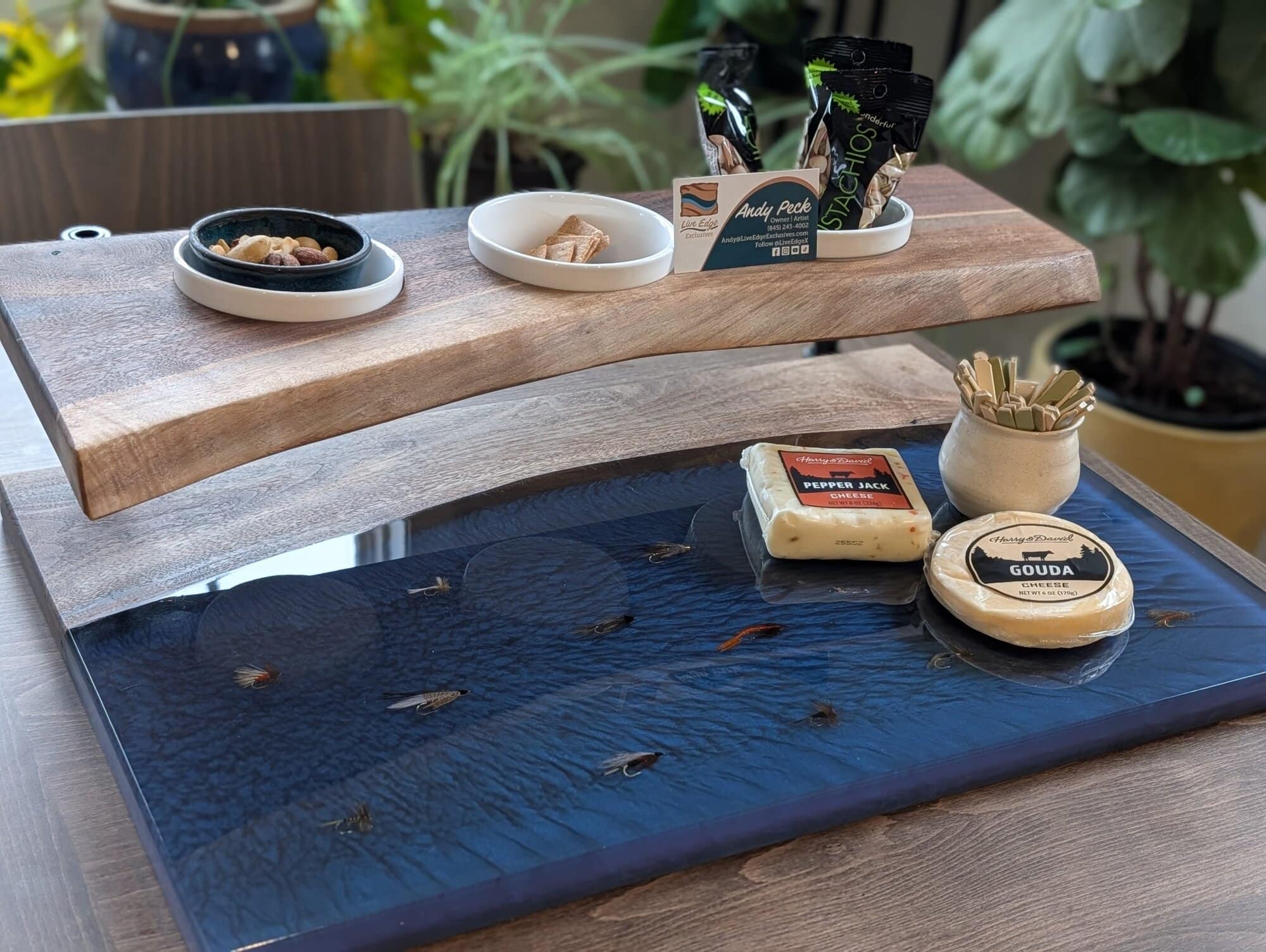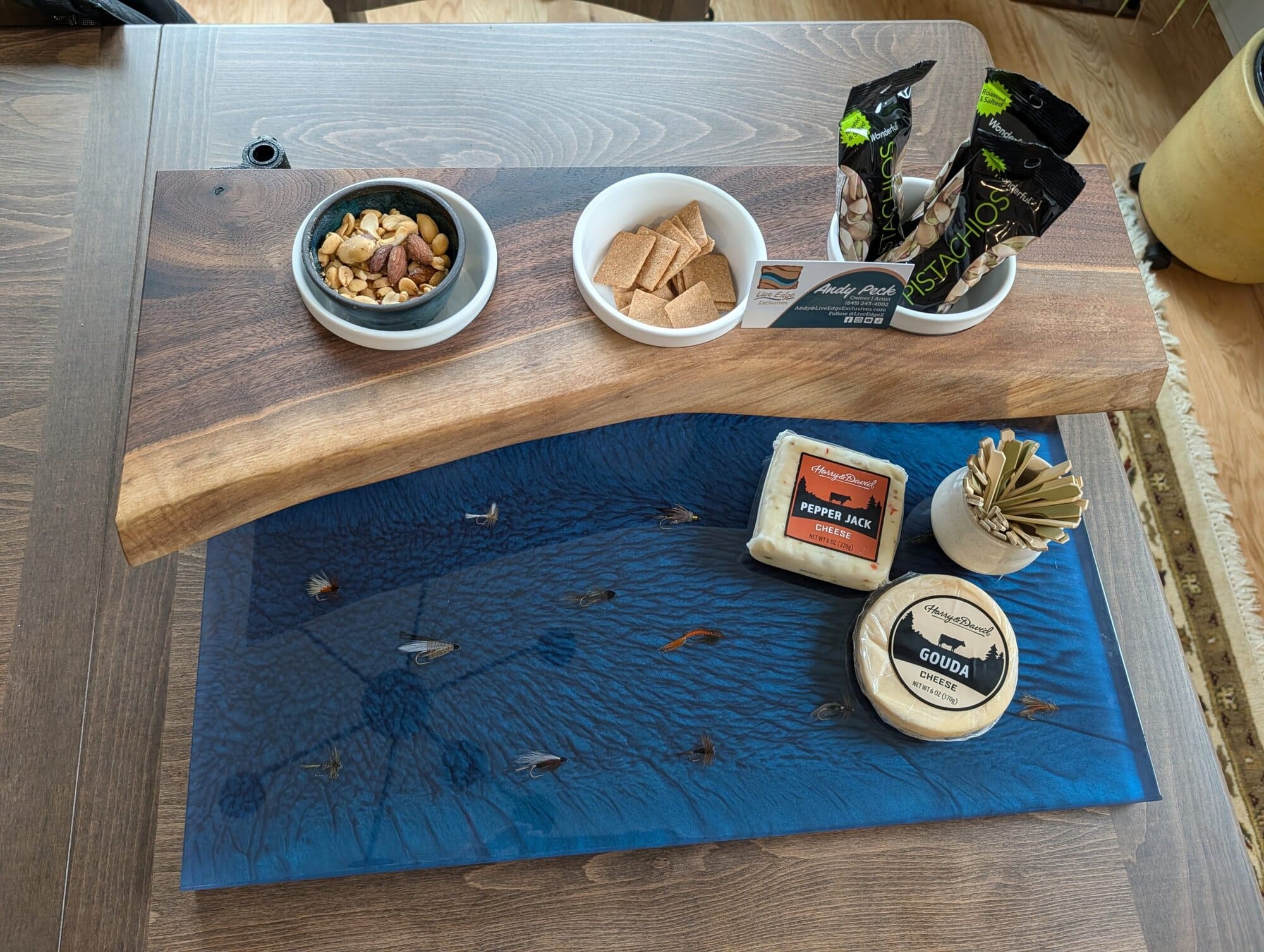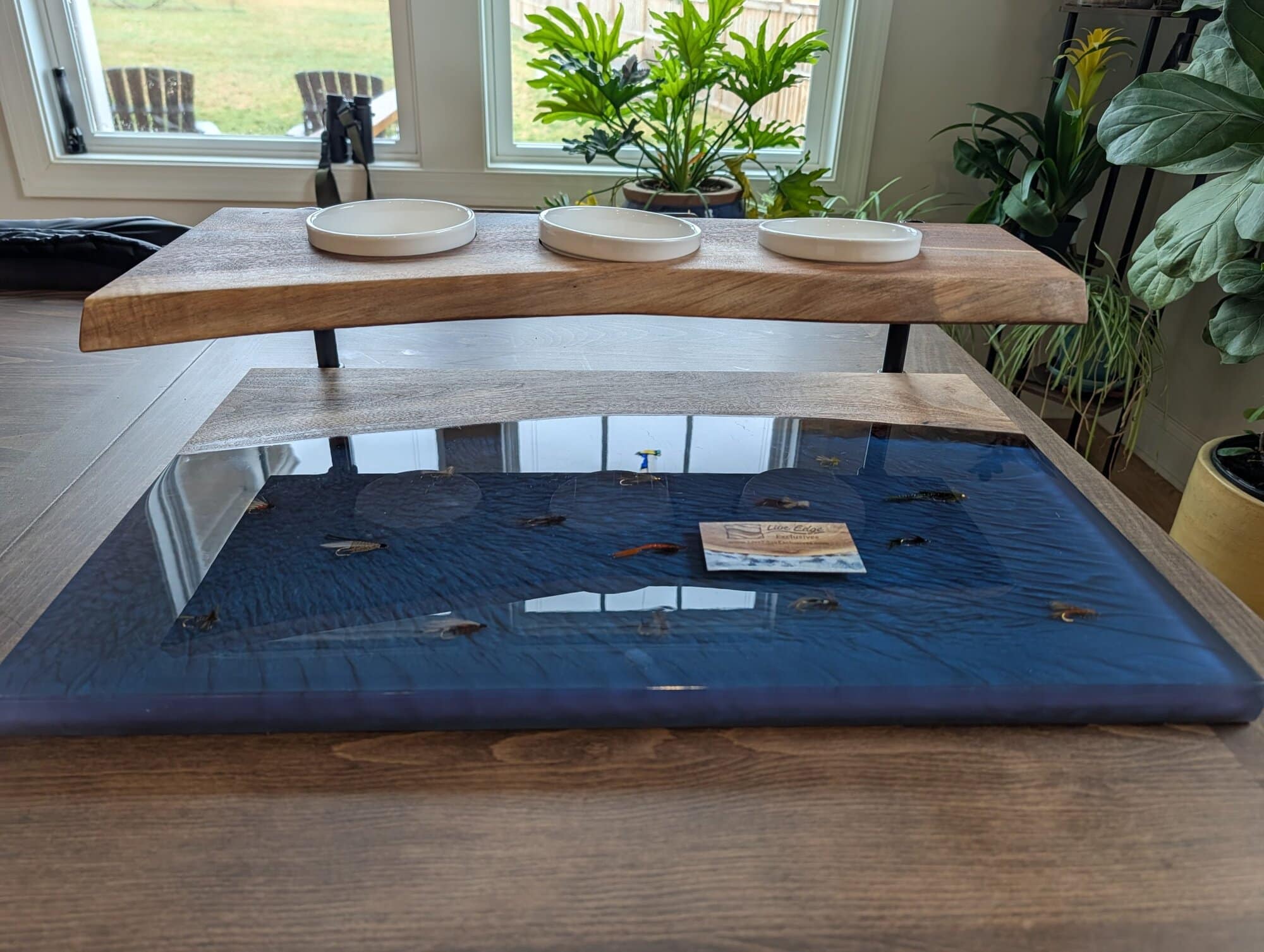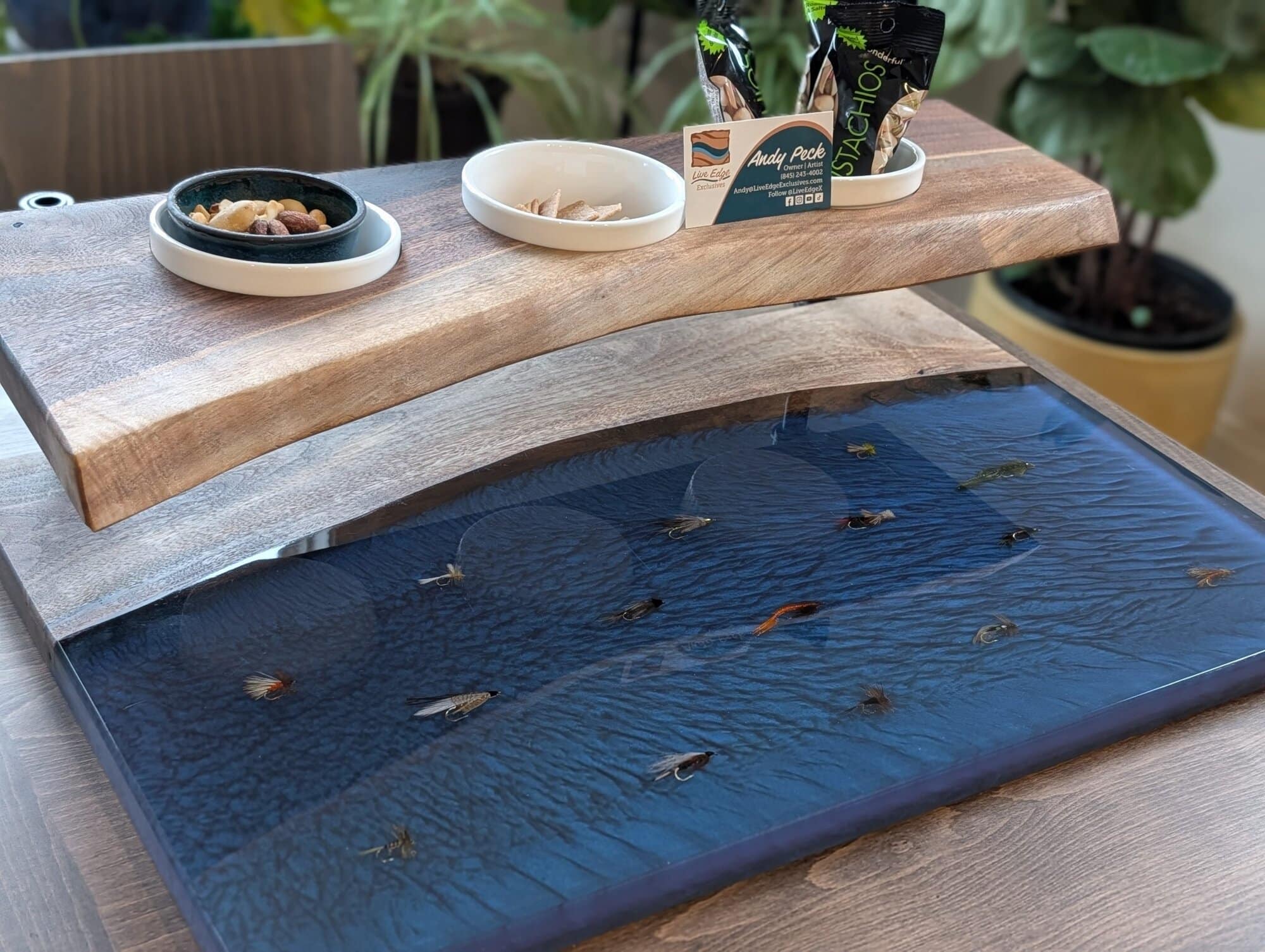 Enter to win a beautiful, one-of-a-kind handmade live edge resin charcuterie board featuring three coordinating serving bowls and a stunning two-tier design. Delicately preserved trout flies are set into crystal-clear resin, creating a piece that reflects the artistry of fly fishing and the heart of our Fly Fishing Sisterhood.